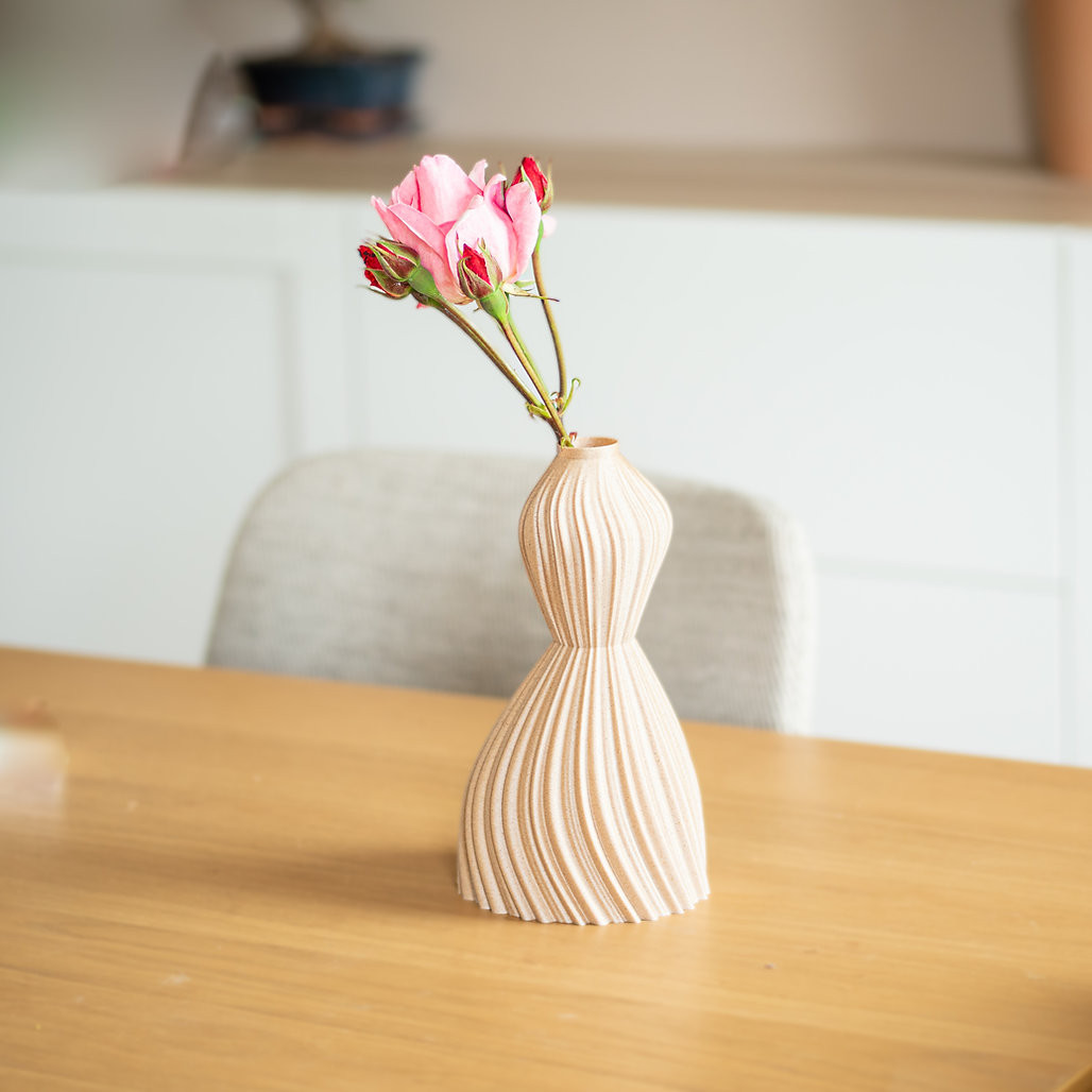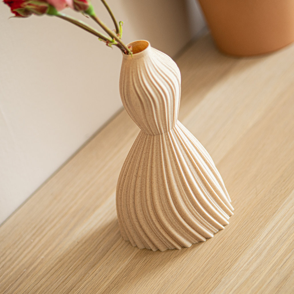 Aurora est un vase décoratif d’une grande finesse, dont la silhouette évoque l’élégance d’une robe de mariée en mouvement. Ses courbes douces et sculpturales transforment chaque bouquet de fleurs séchées en composition artistique. Véritable pièce de design, il apporte douceur, raffinement et poésie à tout espace intérieur, du salon à la chambre en passant par une console d’entrée.
