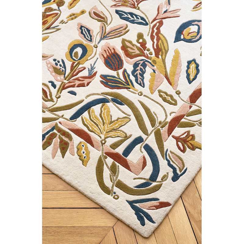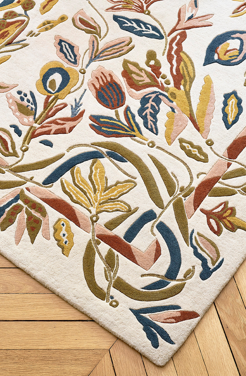 Farandole se distingue par une composition graphique dynamique, faite de formes généreuses et de courbes fluides qui semblent danser ensemble. Ce motif audacieux, inspiré des arts picturaux modernes, crée une atmosphère expressive et joyeuse dans la pièce. Il devient naturellement un point focal, parfait pour rythmer un salon, une entrée ou un espace de travail.